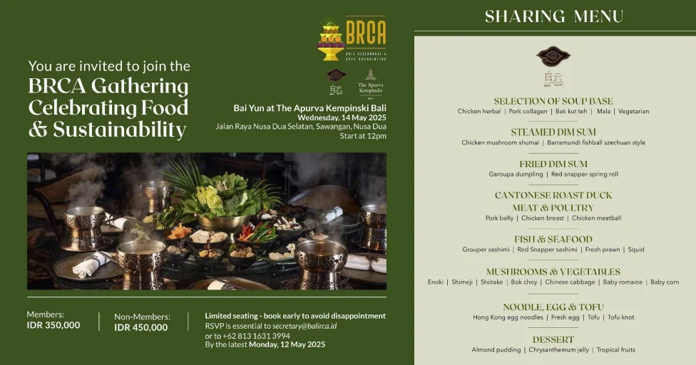 A very special thank you goes out to our partners & sponsors, your generosity goes beyond our lunches, and without your commitment and support there would be no BRCA. You have our gratitude as always, we as hospitality professionals respect and admire the gold standard of hospitality you show towards the BRCA and to Bali’s restaurant community in general.
